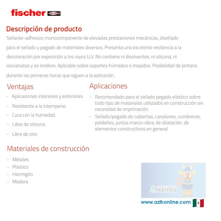 sellante-adhesivo monocomponente de elevadas prestaciones mecánicas, diseñado para el sellado y pegado de materiales diversos. Presenta una excelente resistencia a la decoloración por exposición a los rayos UV. No contiene ni disolventes, ni silicona, ni isocianatos y es inodoro. Aplicable sobre soportes húmedos o mojados. Posibilidad de pintarlo durante las primeras horas que siguen a la aplicación.