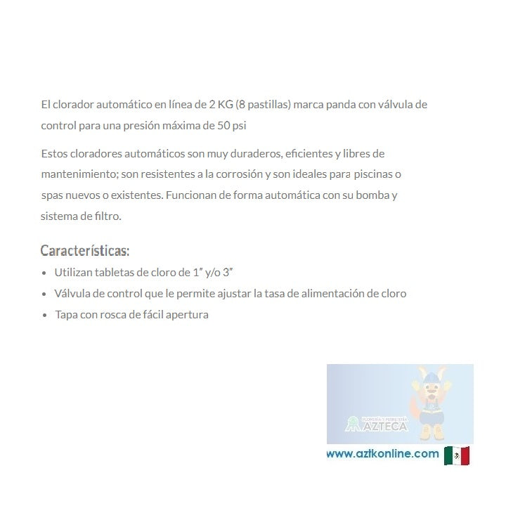 CLORADOR AUTOMÁTICO EN LINEA DE 2KG (8 PASTILLAS) CON VÁLVULA PANDA