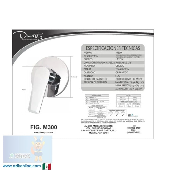 MONOMANDO DE EMPOTRAR PARA REGADERA O TINA CROMADO DINASTY M300